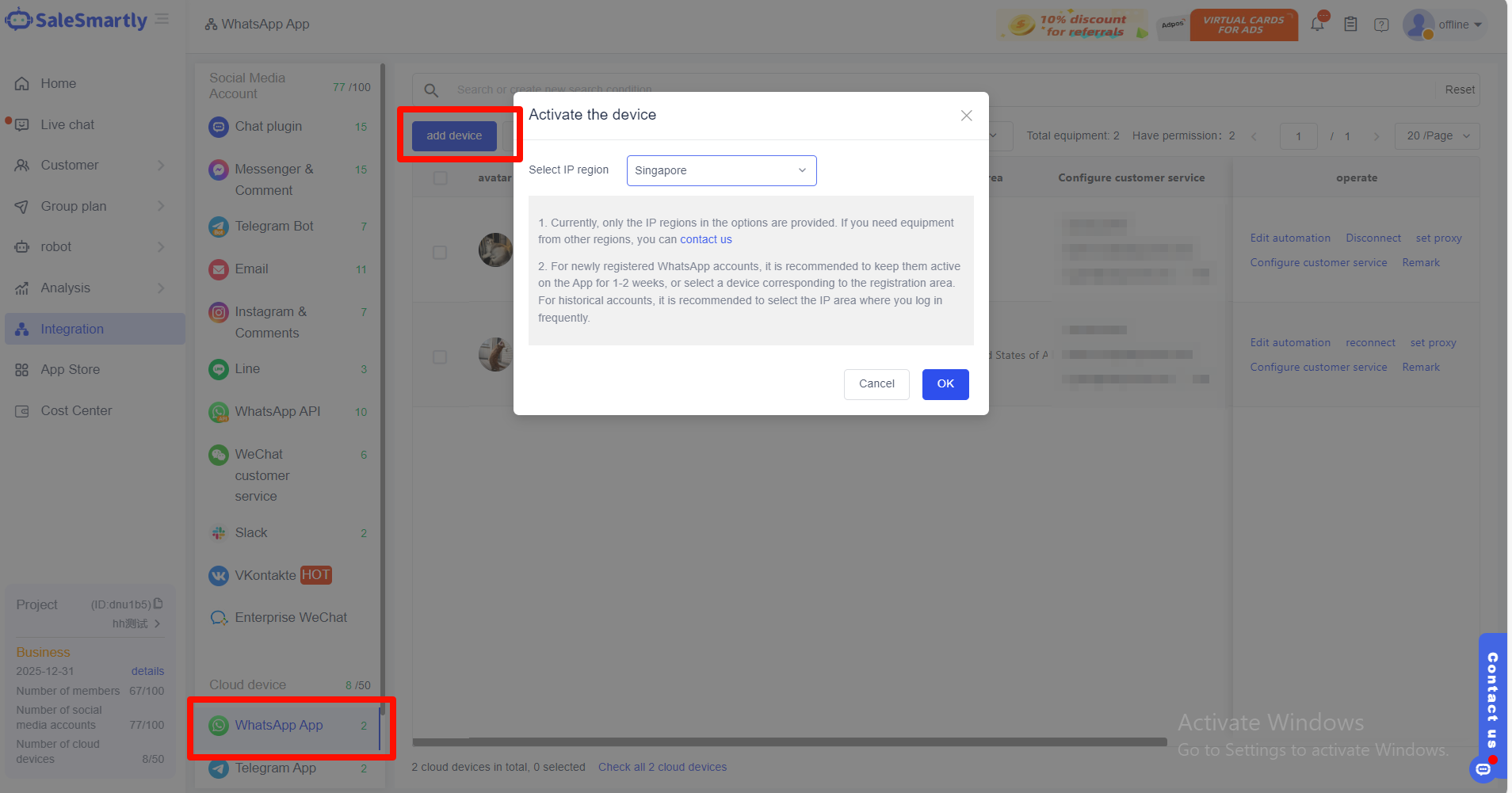 - Đăng nhập vào trang web SaleSmartly, và tìm Tích hợp-Ứng dụng WhatsApp/API WhatsApp-Thêm thiết bị. Đối với phiên bản cá nhân và doanh nghiệp, bạn chỉ cần quét mã QR qua ứng dụng di động để đăng nhập. Đối với phiên bản API, vui lòng tham khảo hướng dẫn này trong Trung tâm Trợ giúp.