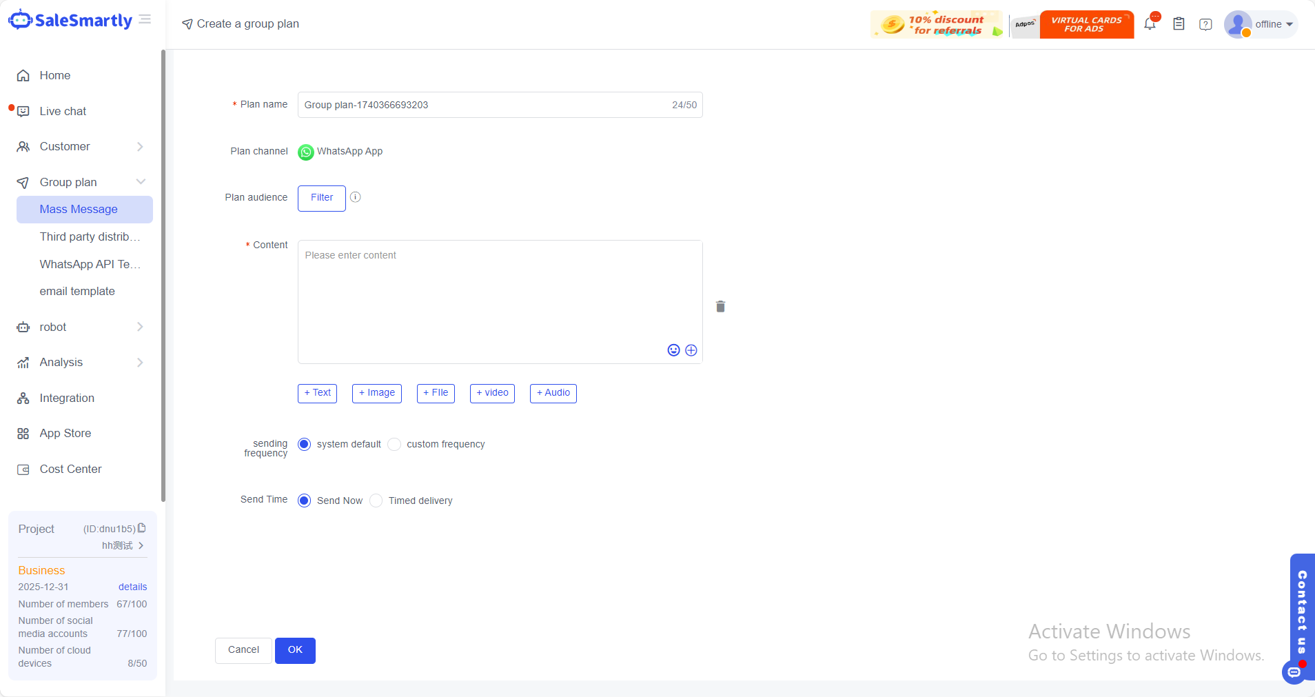 - Tìm Tạo kế hoạch tin nhắn nhóm trong Tin nhắn nhóm và chọn kênh WhatsApp. Bạn có thể chọn nhiều đối tượng cùng lúc thông qua kênh này, không giới hạn số lượng người, và nội dung cũng tương thích với nhiều định dạng.