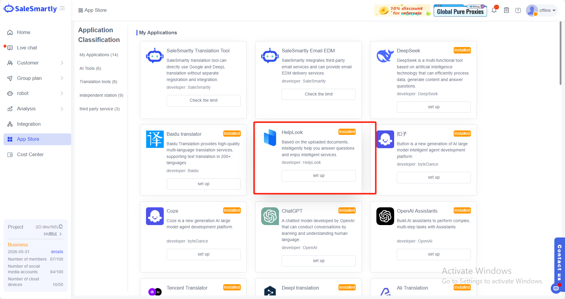 Đăng nhập vào trang quản trị SaleSmartly, tìm công cụ bên thứ ba HelpLook trong cửa hàng ứng dụng và nhấp để cài đặt.