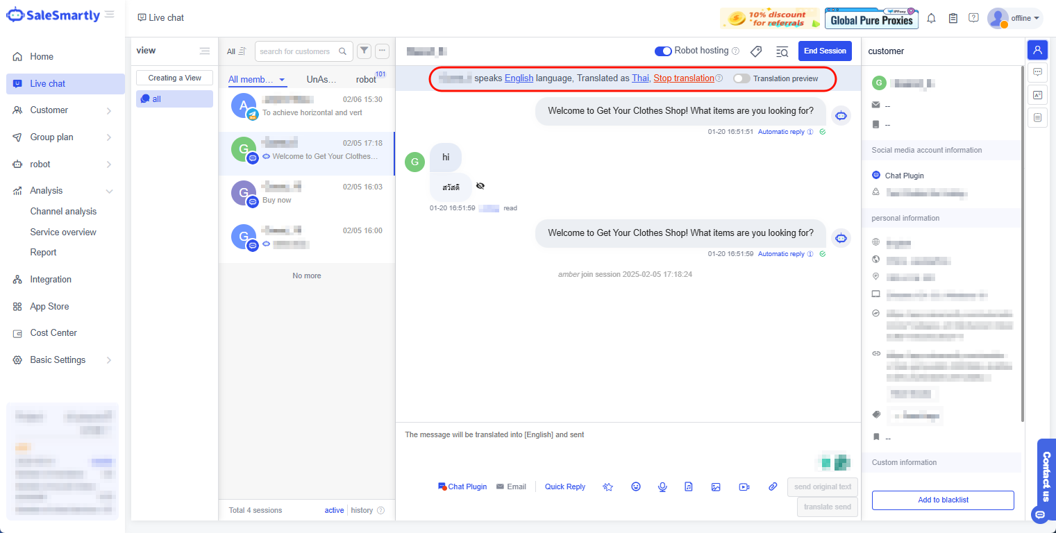 Một trong những tính năng nổi bật của SaleSmartly là dịch thuật thời gian thực, cho phép giao tiếp đa ngôn ngữ mượt mà. Dù bạn là một startup nhỏ hay tập đoàn đa quốc gia, tính năng này đảm bảo việc tương tác với khách hàng diễn ra nhanh chóng và hiệu quả trên mọi ngôn ngữ khác nhau.