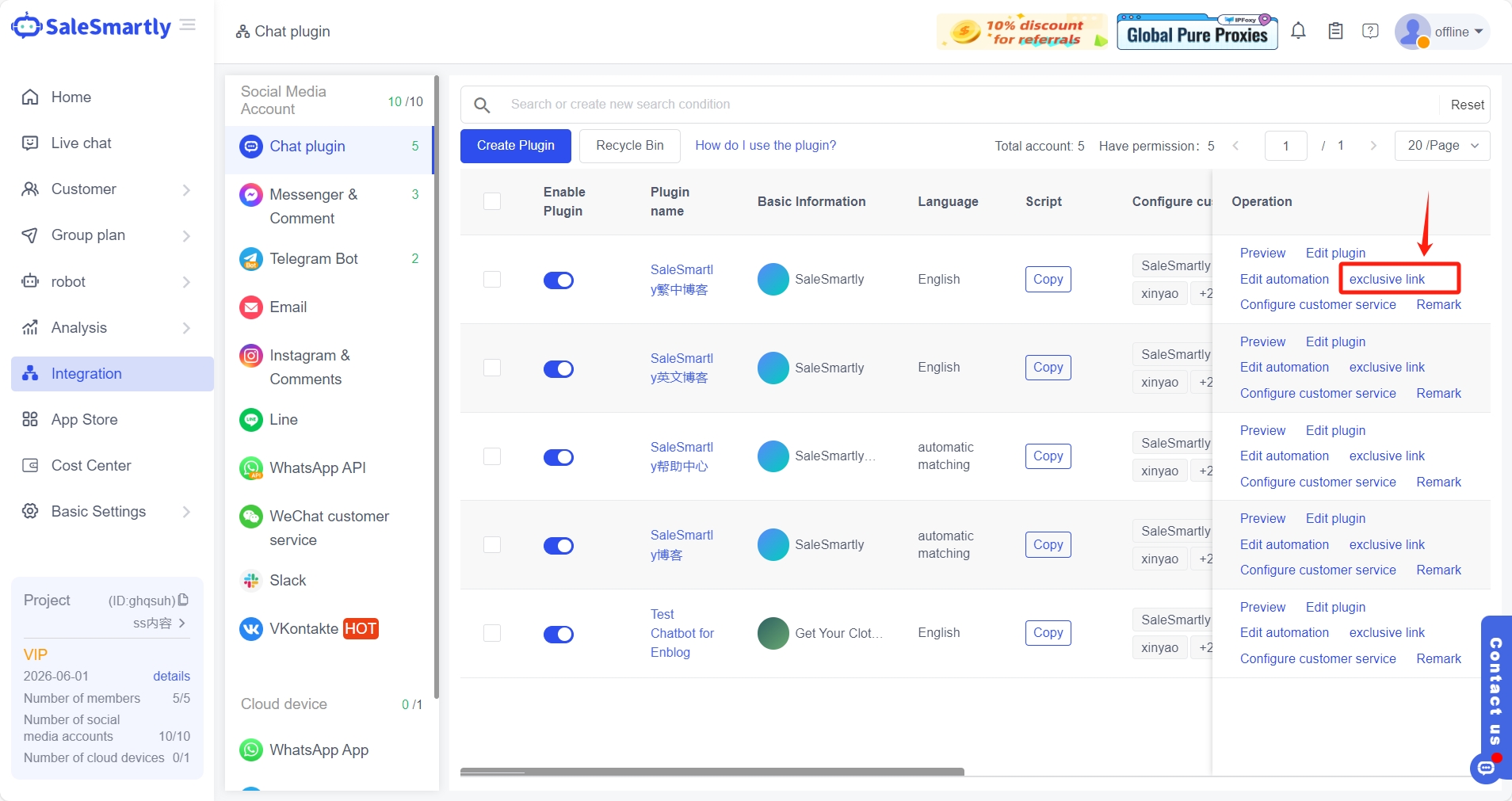 Tìm plugin trò chuyện trong Tích hợp trên trang web chính thức của SaleSmartly, và bạn có thể tìm thấy "liên kết độc quyền" trong phần hoạt động. "Liên kết độc quyền" này có thể được đặt ở bất kỳ đâu bạn muốn. Chỉ cần nhấp vào liên kết hoặc quét mã QR, khách hàng có thể liên hệ với bạn ngay lập tức. Liên kết độc quyền như vậy không chỉ giúp khách hàng dễ dàng nhận được dịch vụ mà còn giúp dịch vụ khách hàng theo dõi dịch vụ khách hàng.