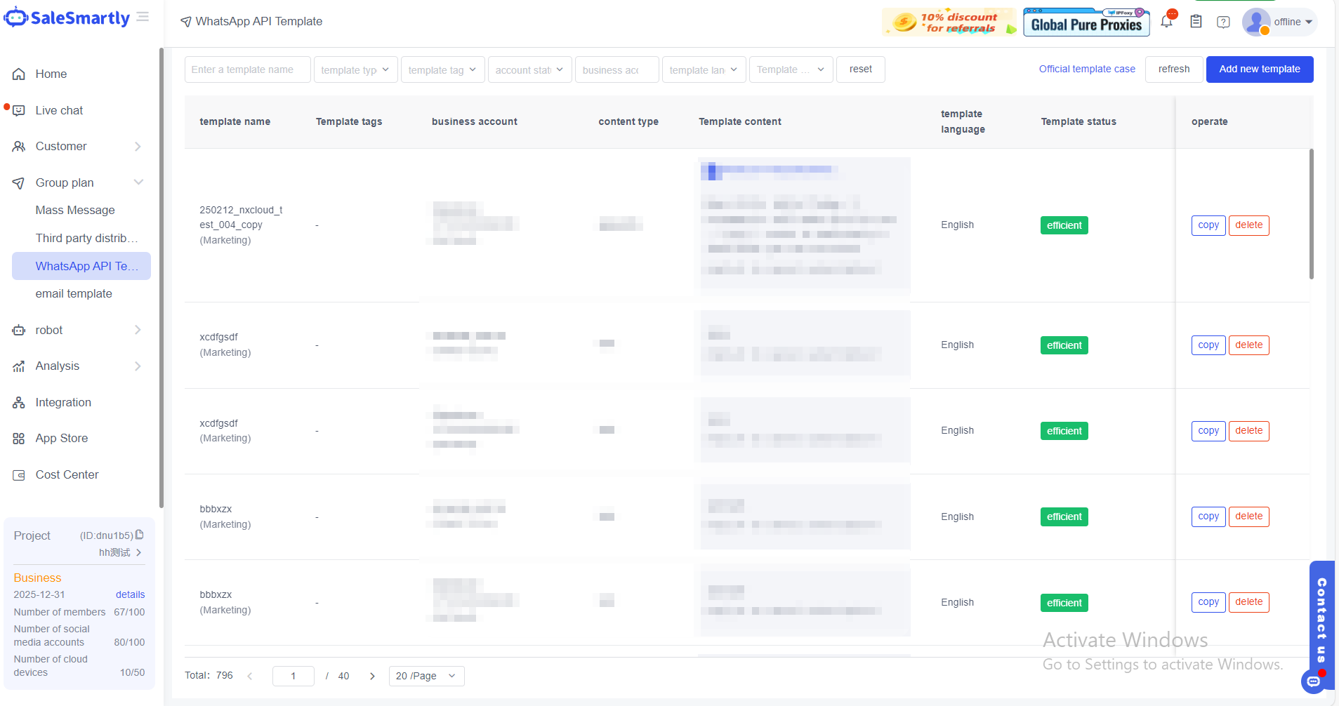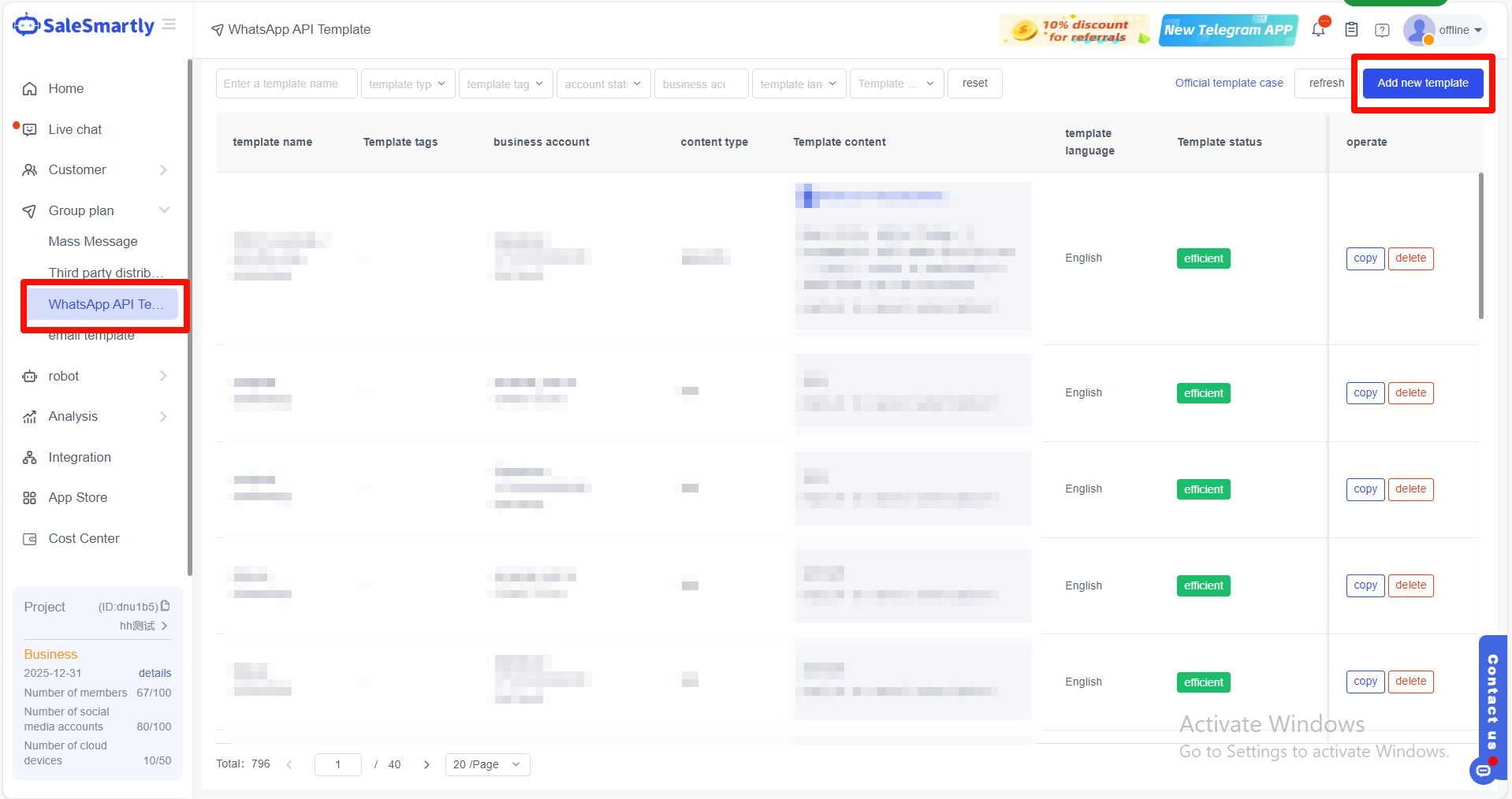 Nếu bạn muốn đăng ký thêm mẫu tin nhắn WhatsApp trong tương lai, bạn có thể gửi yêu cầu trực tiếp trong backend SaleSmartly. Chúng tôi sẽ chuyển yêu cầu của bạn đến WhatsApp để xem xét chính thức, nhưng lưu ý rằng quyền phê duyệt cuối cùng thuộc về WhatsApp và chúng tôi không thể đảm bảo mẫu sẽ được phê duyệt.