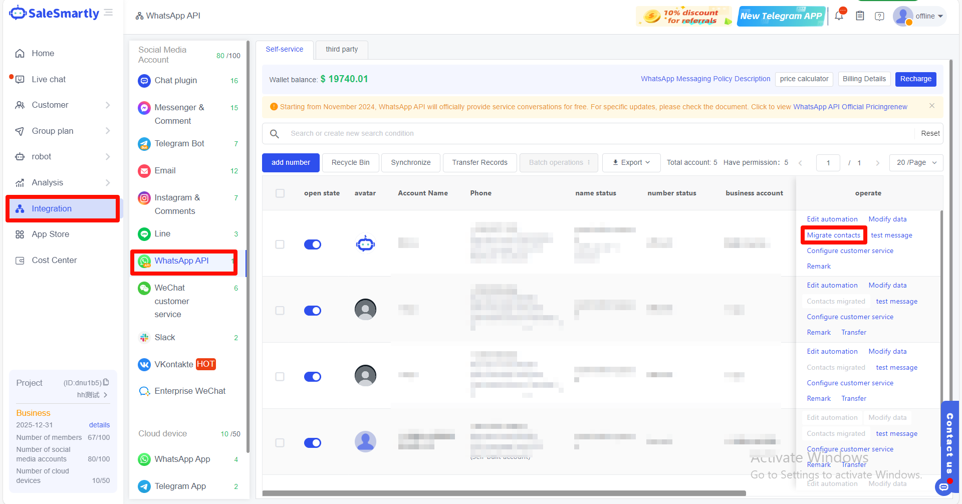 - Tìm tài khoản của bạn trong Tích hợp-WhatsApp API và nhấp vào Di chuyển Liên hệ.