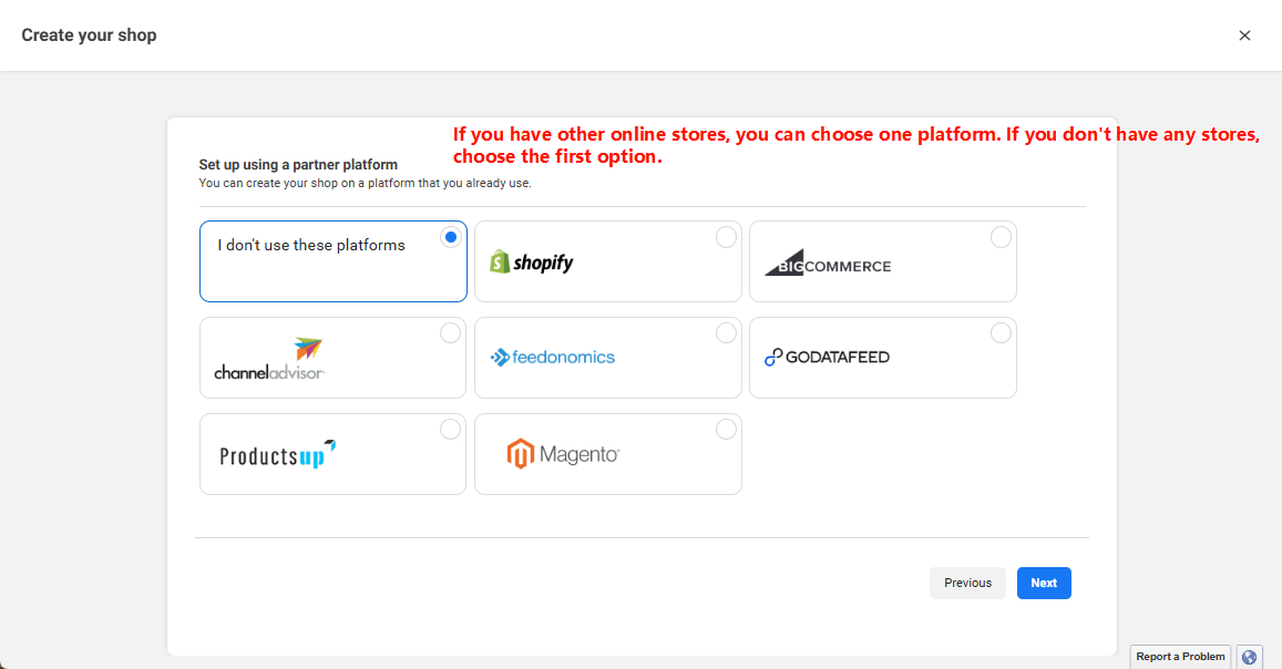 - Nếu bạn không có cửa hàng trên các nền tảng khác và chỉ muốn bán hàng trên Facebook Shop, bạn có thể chọn tùy chọn đầu tiên Tôi không sử dụng các nền tảng này. Sau khi chọn, nhấp vào Tiếp theo.