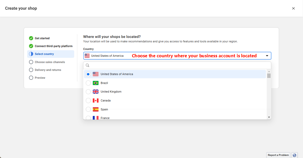 4.4. Chọn Quốc gia mà Cửa hàng Facebook của bạn đặt tại