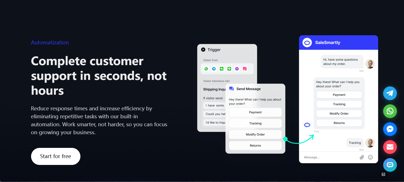 Đồng thời, bạn cũng có thể thiết lập robot trả lời tự động trong SaleSmartly, nhập một số từ cơ bản và giới thiệu chức năng vào hệ thống, và khi khách hàng hỏi các câu hỏi liên quan, robot có thể tự động trả lời để giúp bạn xử lý thông tin từ các mạng xã hội nước ngoài 24 giờ một ngày, cải thiện đáng kể tốc độ phản hồi. Phản hồi kịp thời cũng giúp cải thiện sự hài lòng của khách hàng.