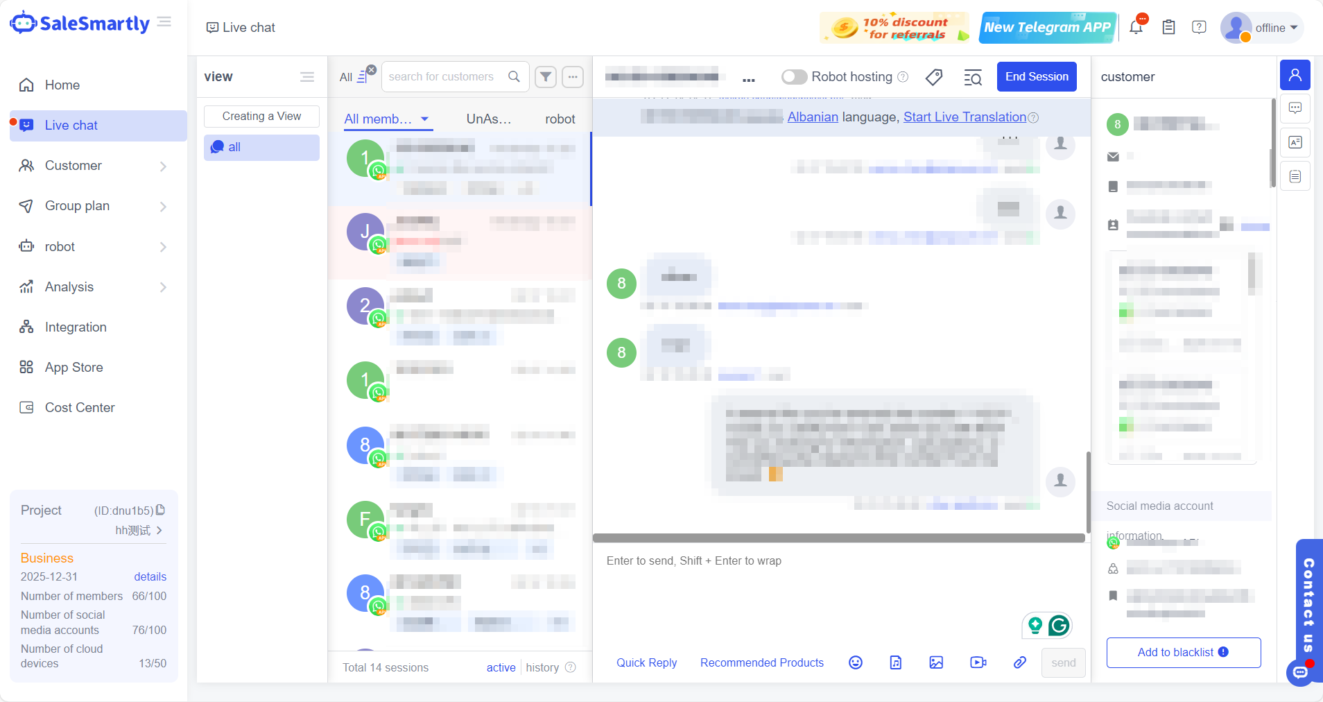 Với việc truy cập thống nhất vào SaleSmartly, không chỉ có thể trả lời câu hỏi của khách hàng trong cùng một bảng điều khiển, giảm chi phí nhiều thiết bị về không, mà còn có thể tự động phân bổ cuộc trò chuyện cho các nhân viên dịch vụ khách hàng khác nhau, điều này tăng hiệu quả dịch vụ đáng kể!