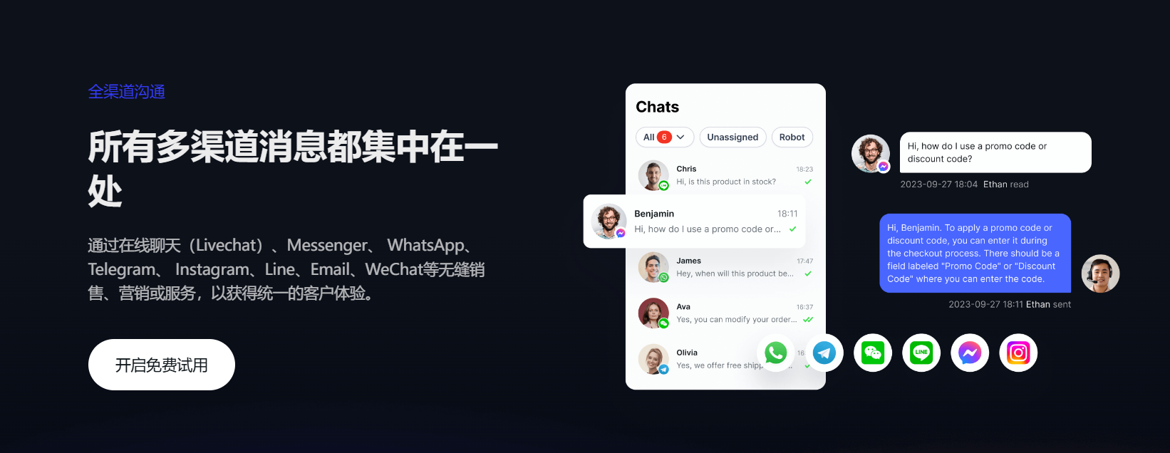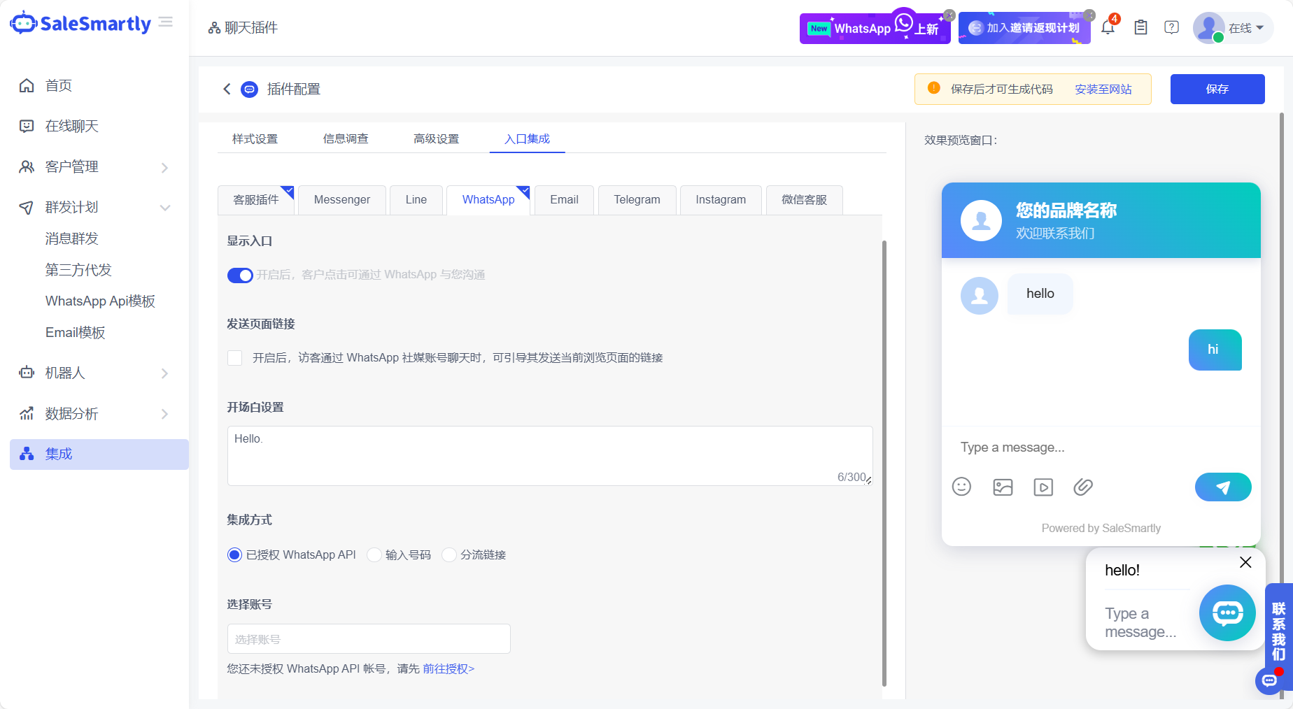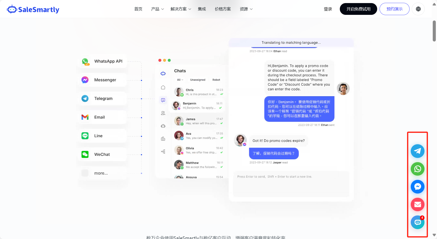 - SaleSmartly không chỉ hỗ trợ tích hợp với WhatsApp mà còn với nhiều kênh mạng xã hội khác bao gồm Facebook Messenger, Instagram, Telegram, Line, Email, WeChat, v.v. Tất cả các cài đặt này có thể dễ dàng hoàn thành trên trang được chỉ định. SaleSmartly có thể dễ dàng quản lý tin nhắn từ nhiều kênh một cách thống nhất.