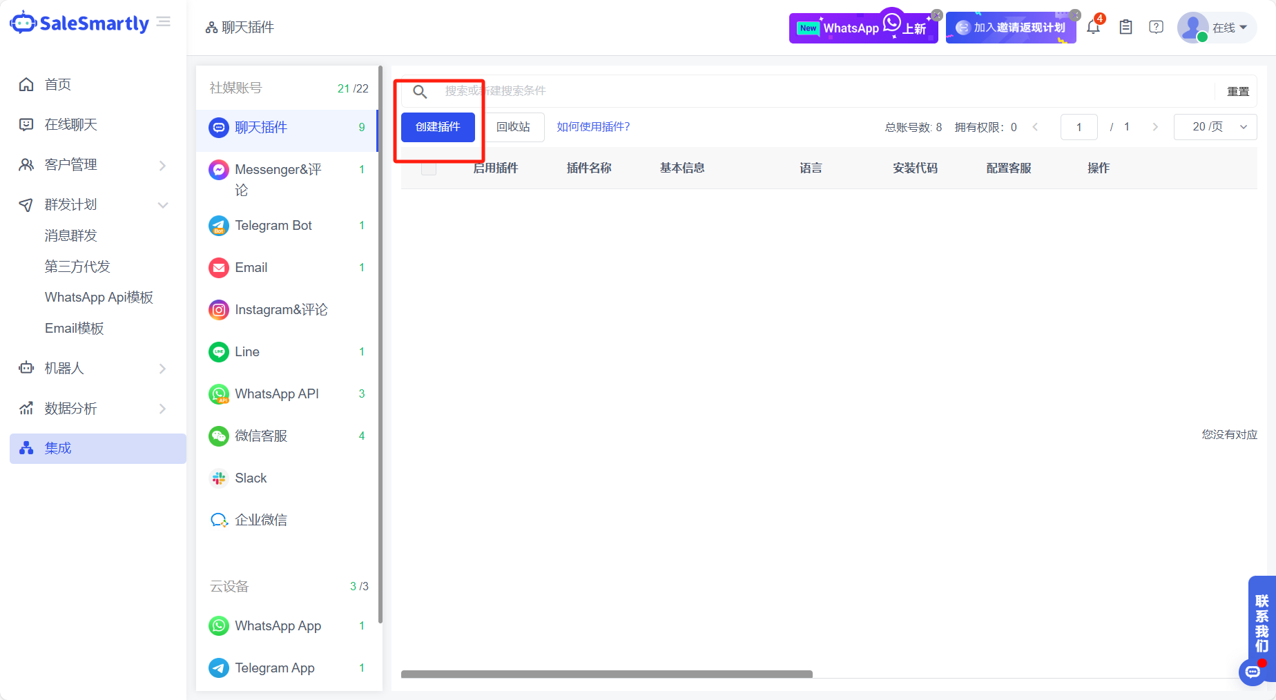 - Mở SaleSmartly và nhấp vào Tạo plugin trong Tích hợp.