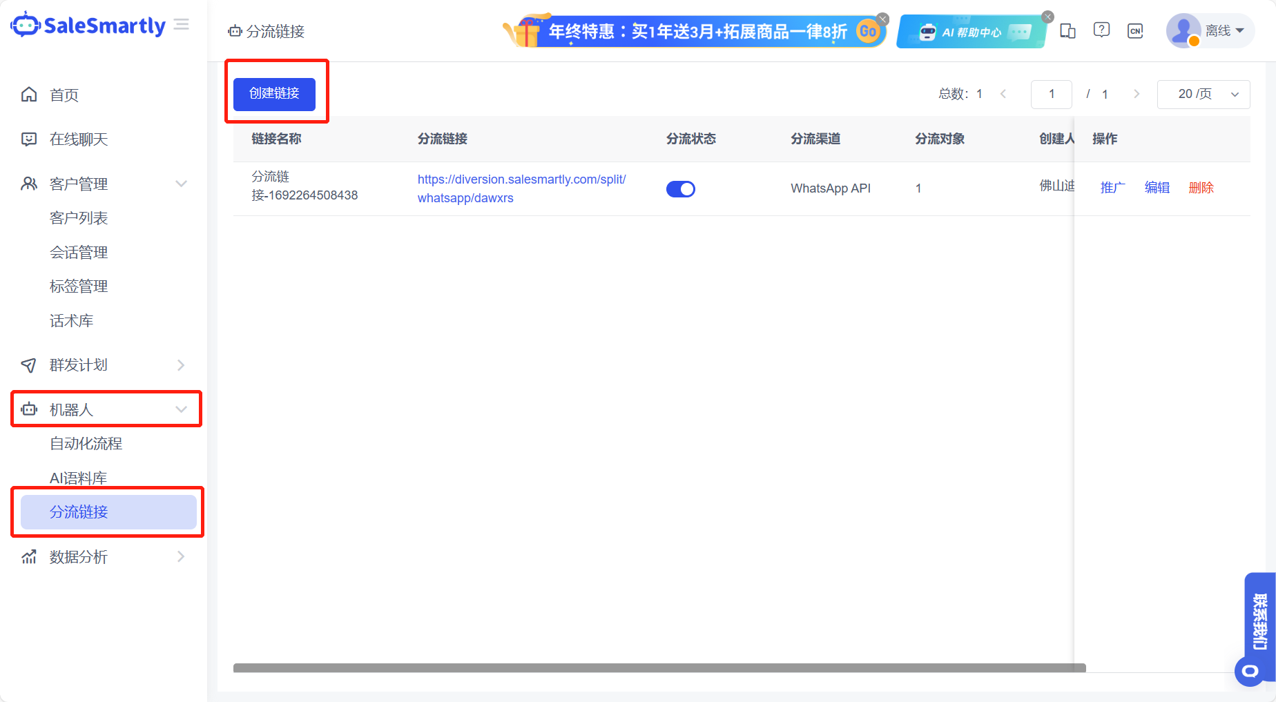 - SaleSmartly cho phép bạn tích hợp nhiều tài khoản WhatsApp. Bằng cách cấu hình liên kết chuyển hướng thông minh, khách hàng có thể được phân bổ vào các tài khoản WhatsApp khác nhau để tiếp nhận dựa trên lựa chọn ngẫu nhiên hoặc nhu cầu trong một khoảng thời gian cụ thể.