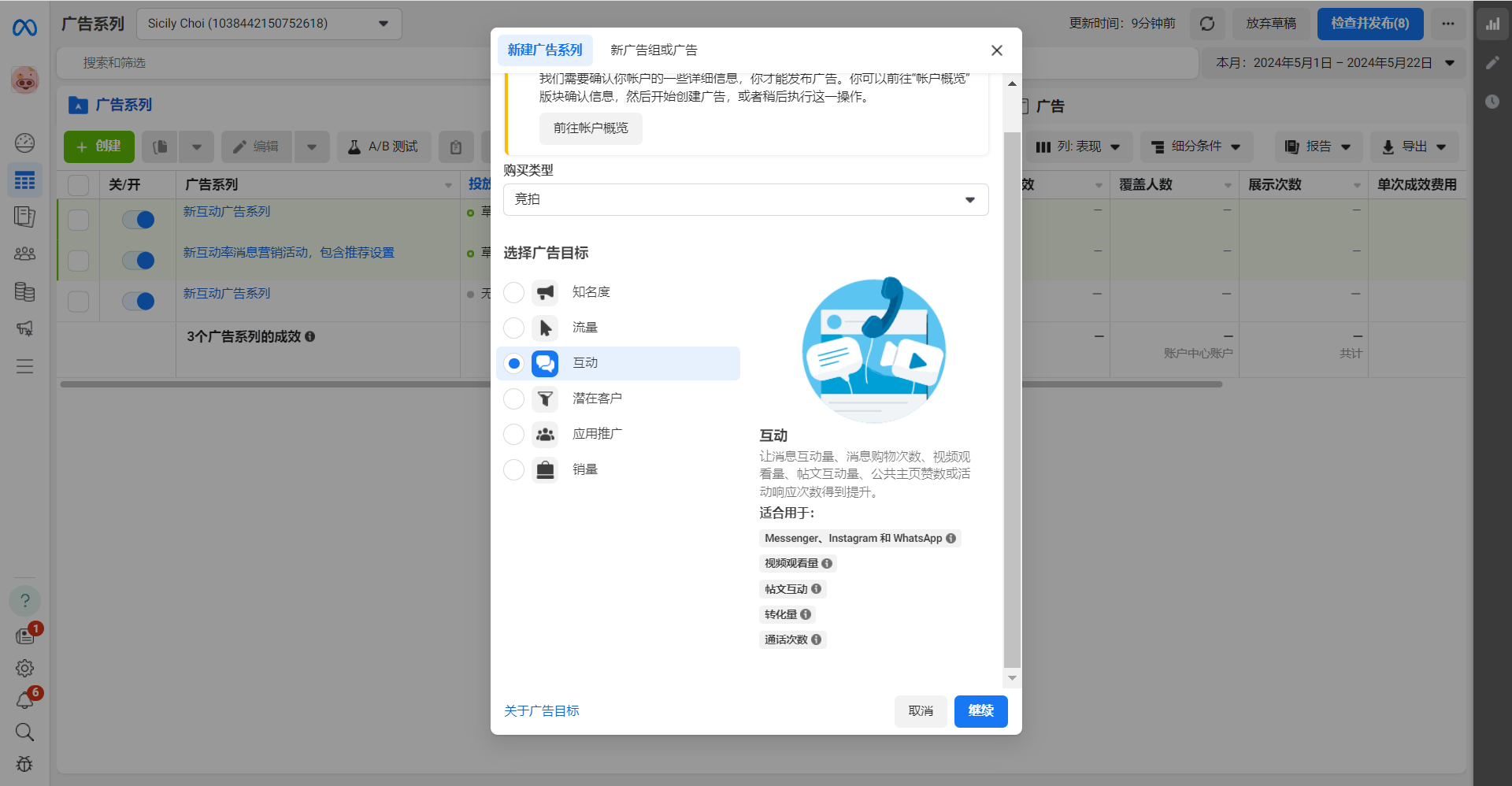 - Chọn một trong các mục tiêu quảng cáo sau và nhấp vào Tiếp tục.