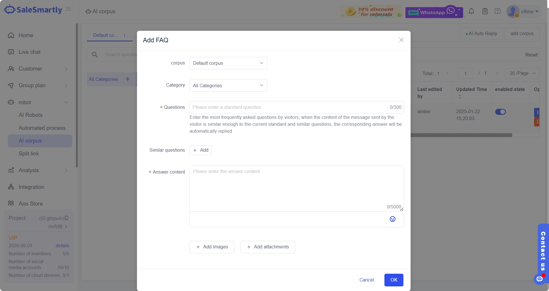 Doanh nghiệp chỉ cần thêm các câu hỏi và câu trả lời thường gặp vào "Kho ngữ liệu AI" trong SaleSmartly. Khi khách hàng đặt những câu hỏi này trên Instagram, SaleSmartly có thể tự động tìm kiếm từ khóa trong tài liệu FAQ và sử dụng AI để tổng hợp câu trả lời phản hồi cho khách hàng, giảm đáng kể khối lượng công việc của bộ phận chăm sóc khách hàng thủ công.