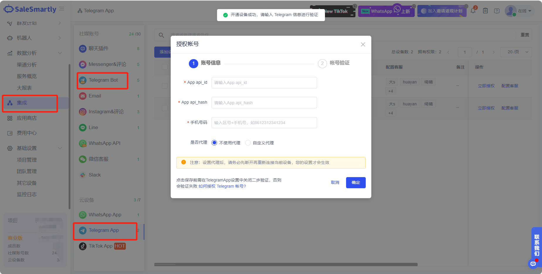 - Mở SaleSmartly và đăng nhập vào tài khoản Telegram bạn muốn mở trong Tích Hợp. SaleSmartly hỗ trợ tích hợp với Telegram bot và tài khoản cá nhân Telegram.