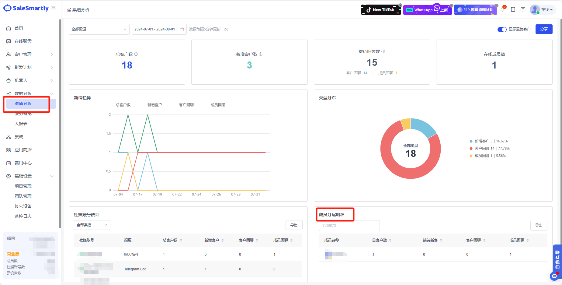 - Nếu người quản lý muốn kiểm tra trạng thái dịch vụ của từng thành viên, có thể tìm thấy chi tiết phân bổ của từng thành viên trong Phân Tích Kênh, nơi hiển thị rõ số lượng khách hàng mà thành viên đã tiếp nhận.