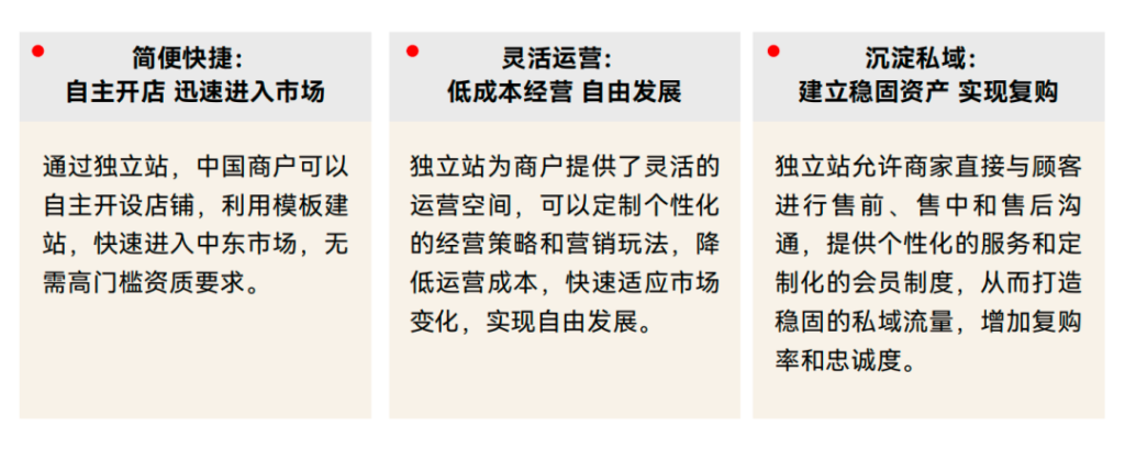 Hiện tại, thị trường e-commerce Trung Đông đã có những người chơi lớn như Souq (nay là Amazon Trung Đông), Noon, Namshi… nhưng với nhà bán hàng Trung Quốc, rào cản gia nhập cao, việc thâm nhập thị trường gặp không ít thách thức. Site độc lập, linh hoạt trong vận hành và thuận lợi cho tích lũy lưu lượng miền riêng, đang dần trở thành lựa chọn mới để vào thị trường Trung Đông.