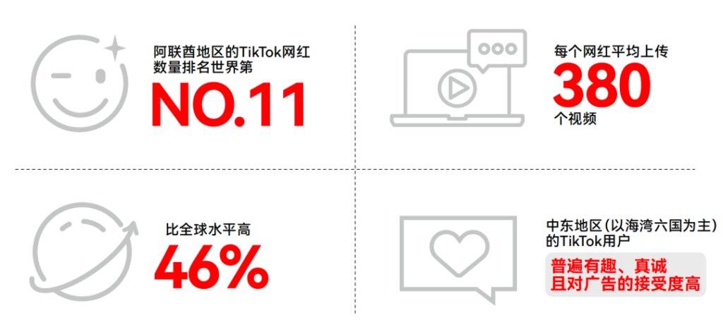 Trong 6 quốc gia vùng Vịnh, Ả Rập Xê Út và UAE có lượng người dùng TikTok hoạt động nhiều nhất. Theo Statista và HypeAuditor, năm 2023 tỷ lệ thâm nhập TikTok tại hai nước này vượt 100%; số lượng influencer TikTok tại UAE đứng thứ 11 thế giới, trung bình 380 video/người, cao hơn 46% so với mức trung bình toàn cầu. Người dùng TikTok Trung Đông có đặc trưng vui vẻ, chân thành, cởi mở với quảng cáo, đề cao giá trị, sự tiện lợi và trải nghiệm mua sắm. Vì vậy, cho thị trường đa dạng này, nhà bán hàng cần hiểu sâu văn hóa địa phương và triển khai chính sách phù hợp.