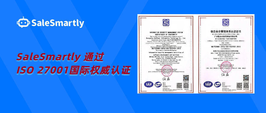 Việc SaleSmartly đạt được chứng nhận này có nghĩa là SaleSmartly đã thiết lập một hệ thống quản lý an ninh phù hợp với tiêu chuẩn quốc tế và có thể cung cấp cho người dùng các dịch vụ phần mềm và giải pháp đáng tin cậy và an toàn.