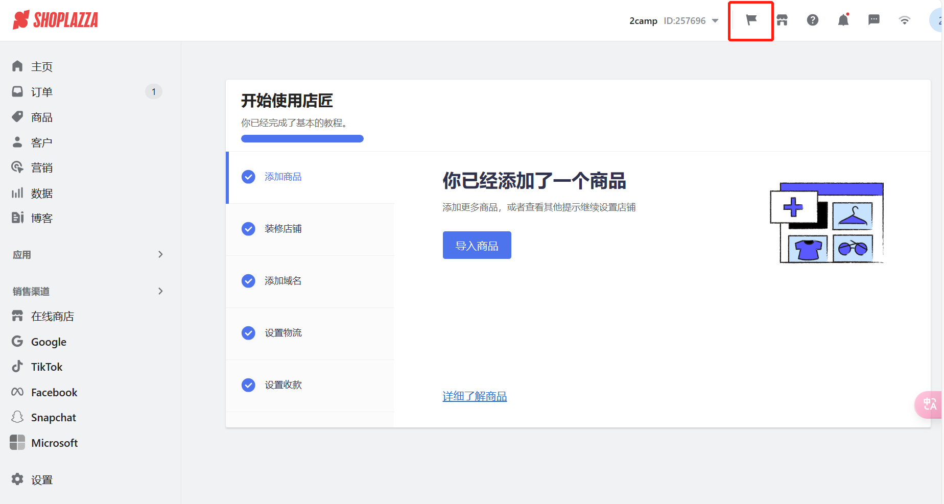 - Đăng ký trên Shoplazza, và hoàn thành hướng dẫn người dùng mới bằng cách nhấp vào cờ ở góc trên bên phải.