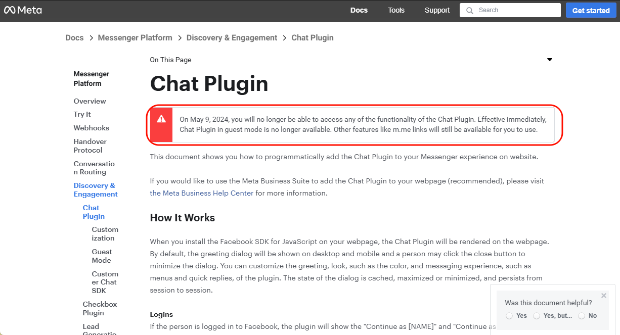 Facebook gần đây đã công bố một cập nhật lớn: kể từ ngày 9 tháng 5 năm 2024, Facebook Chat Plugin sẽ ngừng hoạt động. Điều này có nghĩa là các doanh nghiệp sẽ không còn có thể sử dụng plugin này để giao tiếp trực tiếp với khách hàng trên trang web của họ. Ngoài ra, việc loại bỏ chế độ khách truy cập—cho phép người dùng không phải là Facebook trò chuyện ẩn danh—sẽ làm mất đi một kênh quan trọng để thu hút và hỗ trợ khách hàng tiềm năng không muốn đăng nhập hoặc không có tài khoản Facebook.