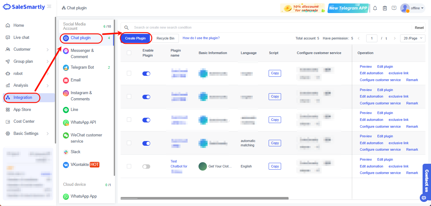 - Sau khi được chuyển hướng đến trang web chính thức của SaleSmartly, nhấp vào "Tạo Plugin" và cấu hình kiểu dáng, nút bấm và cài đặt cửa sổ của plugin.