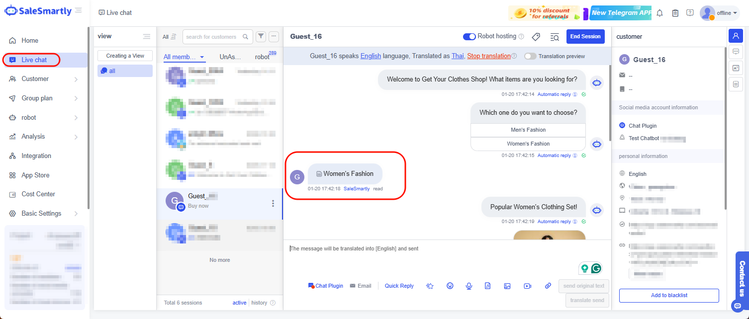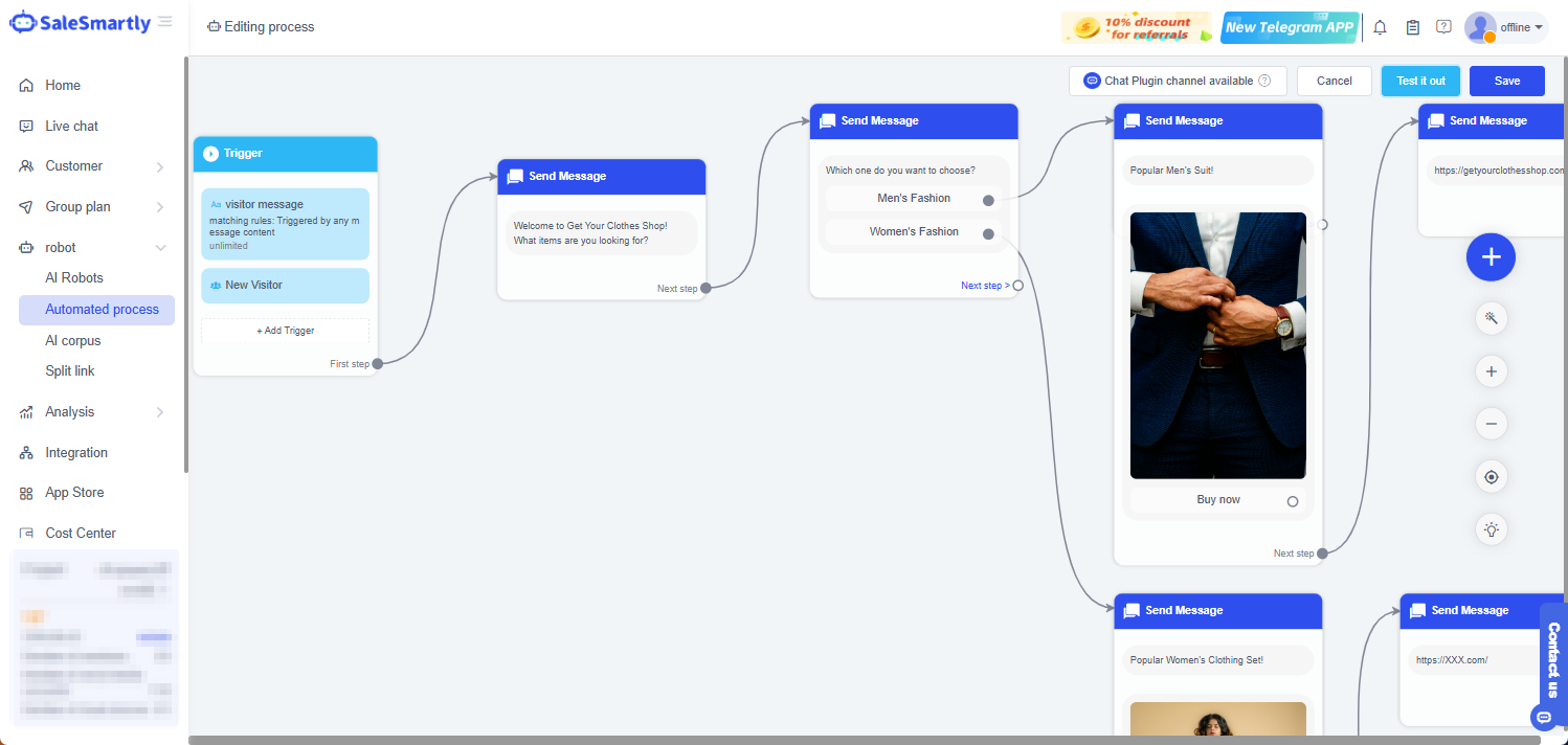 Sau đó, một loạt các thao tác tự động có thể được thiết lập thông qua SaleSmartly, chẳng hạn như trả lời tự động, thu thập thông tin liên hệ, đề xuất sản phẩm và chuyển trò chuyện. Những tính năng tự động hóa này có thể cải thiện đáng kể hiệu quả dịch vụ khách hàng trên trang web riêng, đồng thời cung cấp trải nghiệm cá nhân hóa, giúp doanh nghiệp duy trì tương tác khách hàng chất lượng cao.