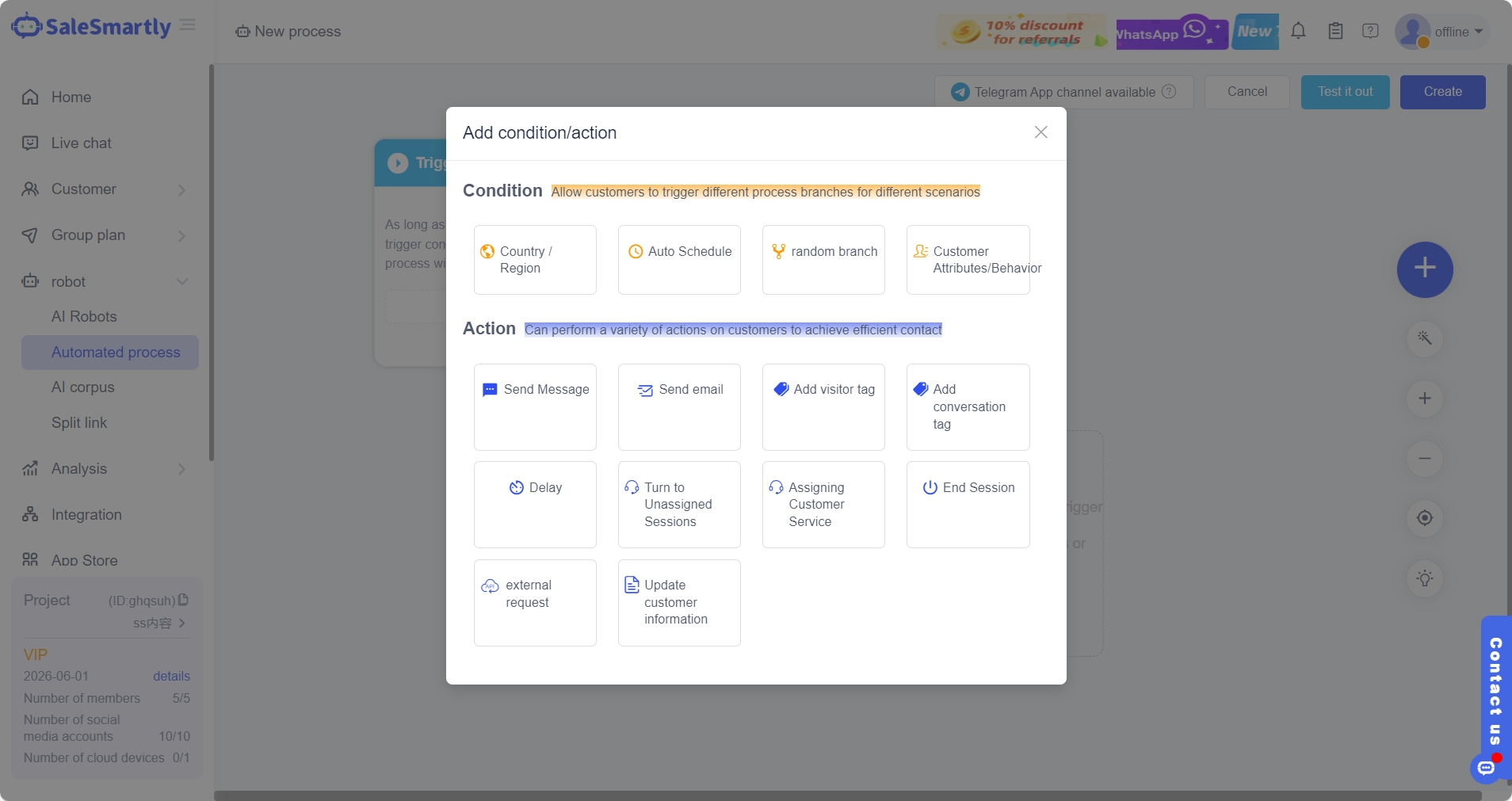Những người có kiến thức kỹ thuật có thể chọn tự phát triển để đáp ứng tốt hơn nhu cầu của riêng họ. Tuy nhiên, để thiết lập nhanh chóng, có thể chọn công cụ xây dựng như SaleSmartly, nơi nội dung được thêm trực tiếp. SaleSmartly có thể phù hợp với các tình huống kinh doanh khác nhau bằng cách sử dụng trình kích hoạt, điều kiện và hành động.