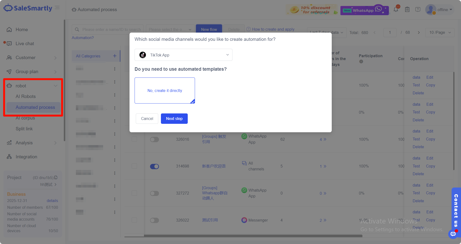 Các công ty có thể sử dụng chức năng robot của nền tảng SaleSmartly - quy trình tự động - chọn kênh TikTok và bắt đầu thiết lập các kịch bản trả lời tự động trước. Khi người dùng gửi một tin nhắn cụ thể, robot sẽ tự động gửi nội dung tương ứng cho người dùng dựa trên các câu trả lời do công ty thiết lập.