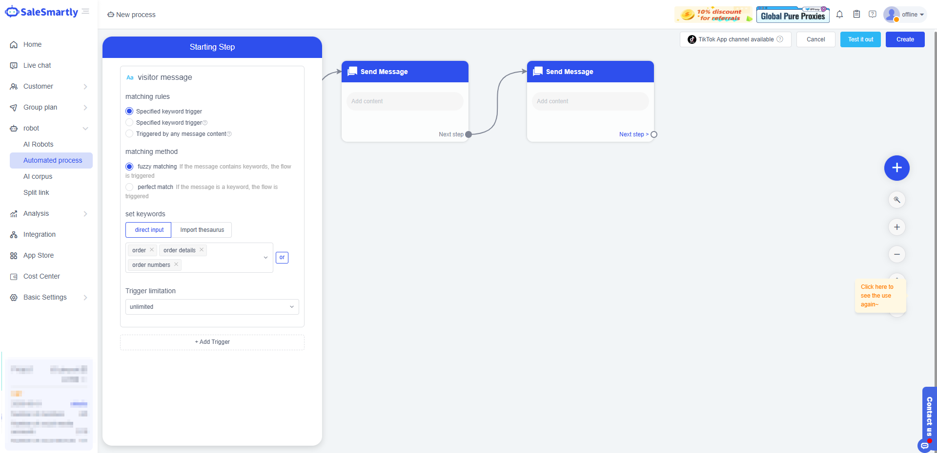 Do tài khoản cá nhân TikTok chính thức không hỗ trợ thiết lập trả lời tự động, chúng ta cần sử dụng SaleSmartly để thực hiện chức năng này.