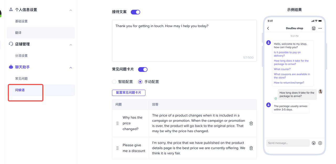 - Tìm biểu tượng cài đặt và nhấp vào trợ lý trò chuyện để thiết lập. Bạn có thể chọn thiết lập Câu hỏi thường gặp và Lời chào.