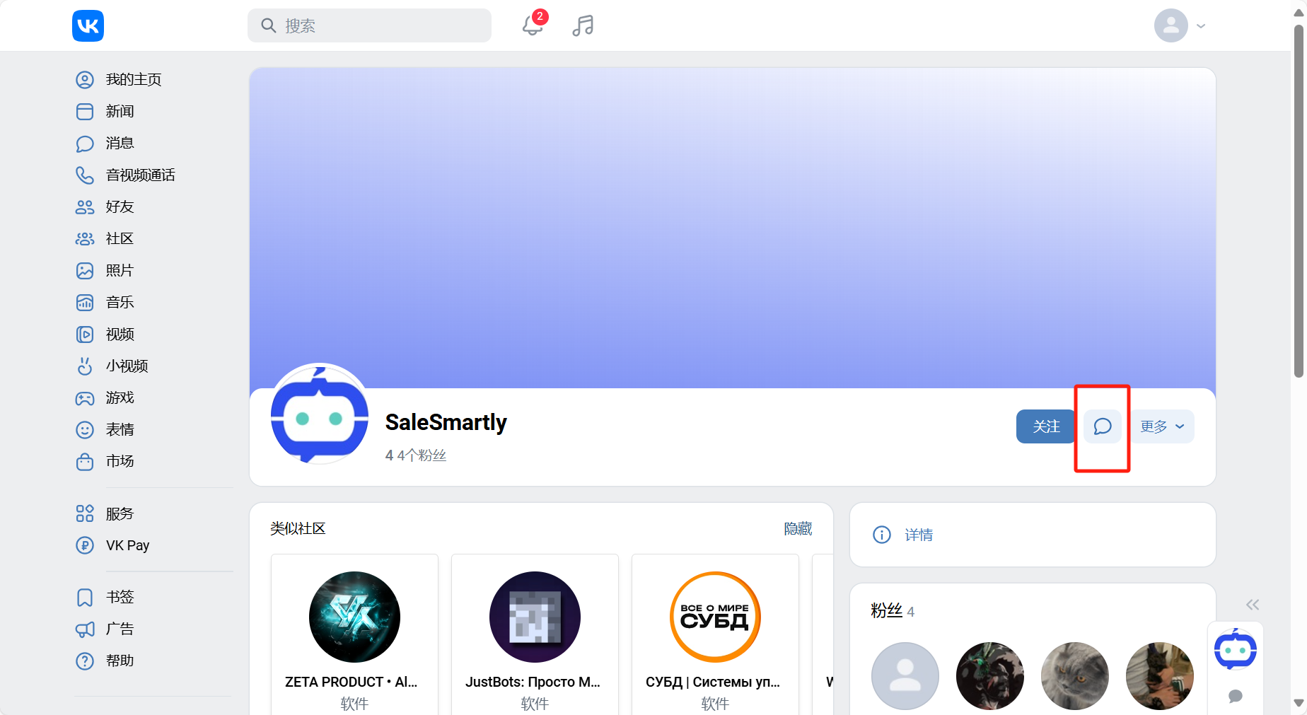 Các cộng đồng VKontakte hơi tương đồng với các trang công khai Facebook, cho phép người dùng liên hệ với nhau thông qua tin nhắn riêng tư khi họ quan tâm đến nội dung cộng đồng hoặc có câu hỏi, vì vậy VK cung cấp một cơ hội tuyệt vời cho các công ty giao tiếp trực tiếp với khách hàng.