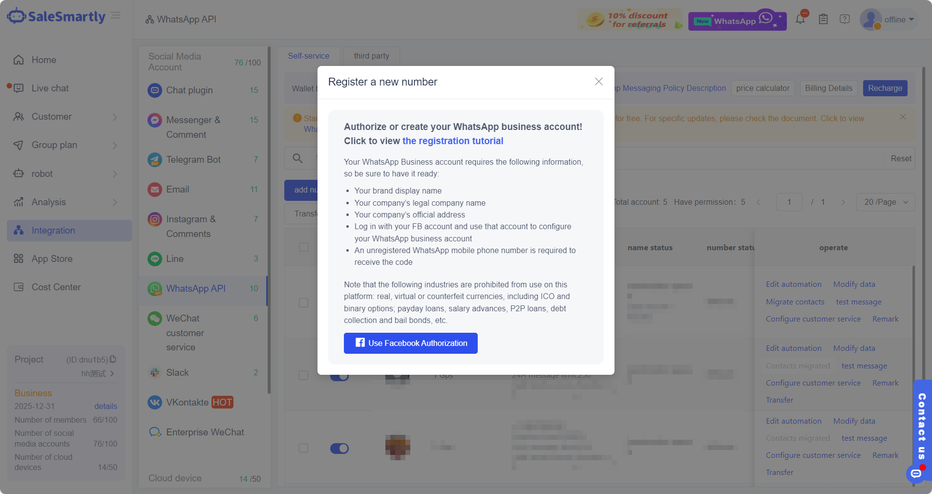Nếu bạn muốn sử dụng thông tin cá nhân để đăng ký, hãy điều hướng đến Tích hợp - API WhatsApp trong backend quản lý của SaleSmartly để tự đăng ký. Nhấp vào nút Sử dụng Ủy quyền Facebook trong khung màu xanh và làm theo hướng dẫn của hệ thống để hoàn tất quy trình.