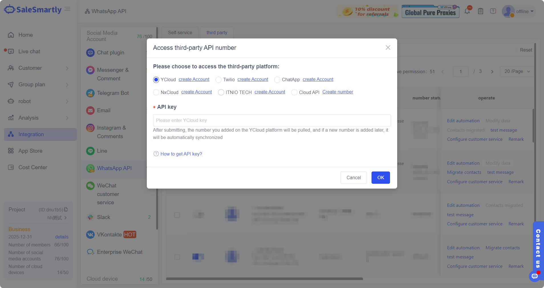 Trong backend của SaleSmartly, dưới mục Tích hợp - API WhatsApp, bạn có thể tìm thấy tùy chọn để thêm số để tự mua.
