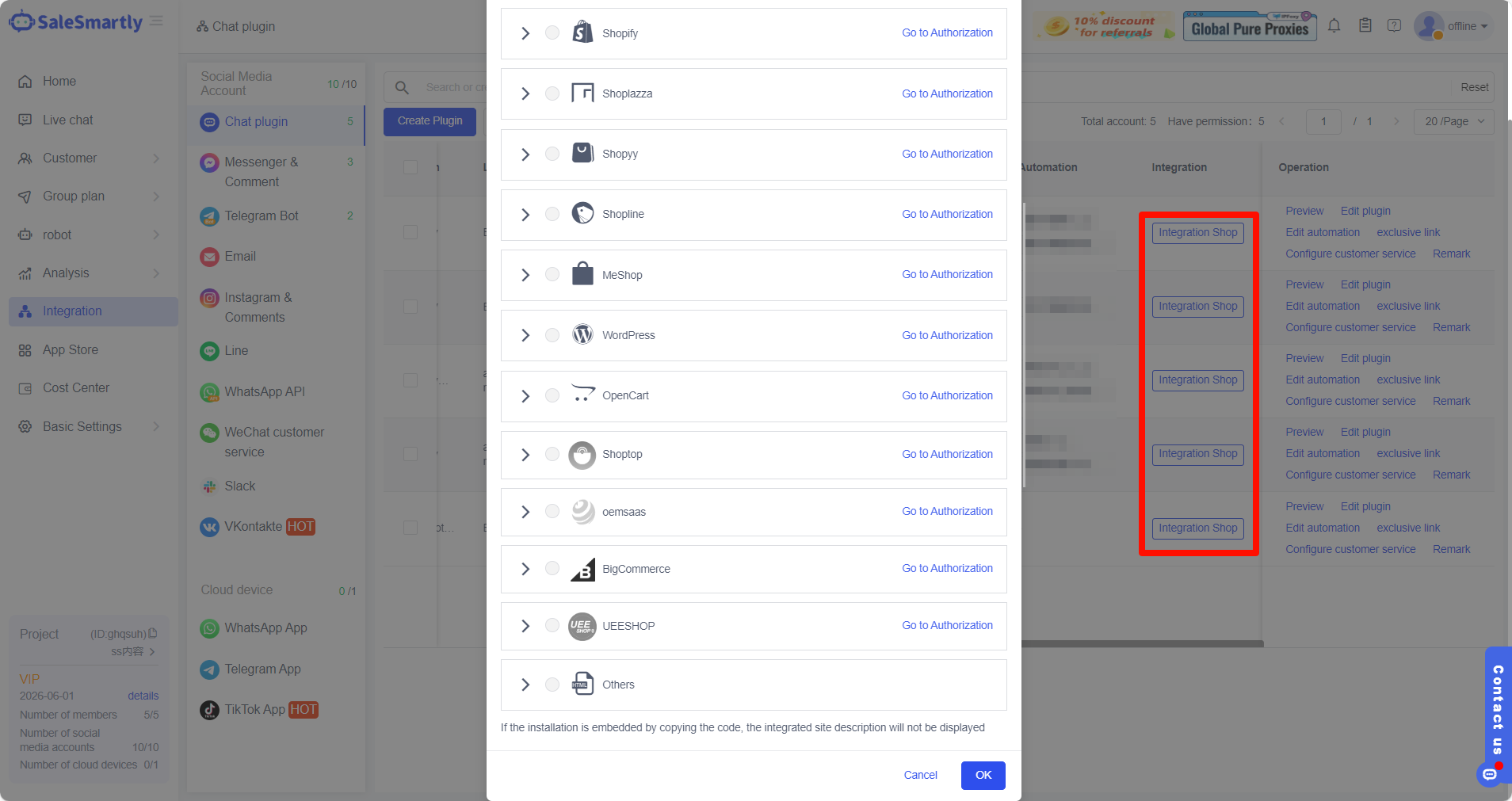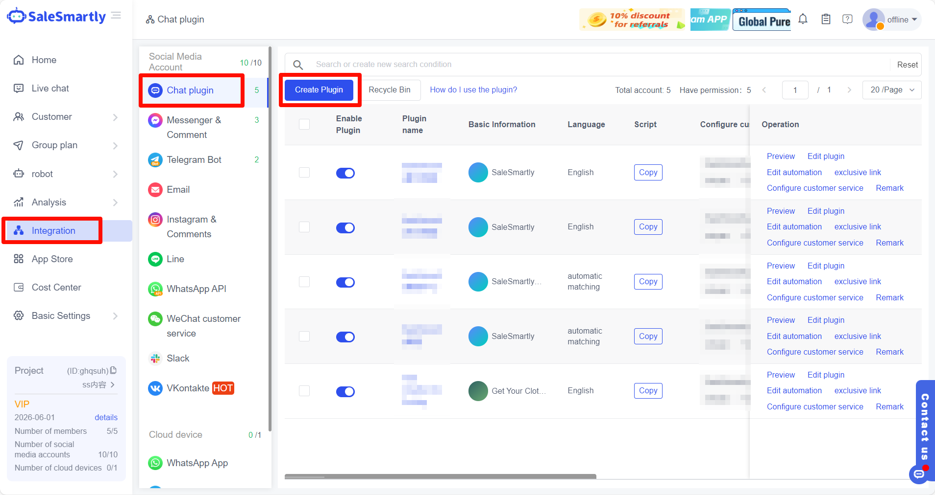 - Mở SaleSmartly, tìm Tích hợp - Plugin Trò chuyện, sau đó tạo một plugin trò chuyện mới.