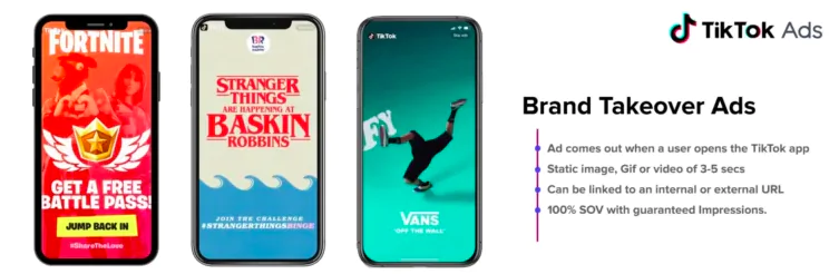 Quảng cáo toàn màn hình tĩnh hoặc động phát trong khoảng 3 đến 5 giây khi mở ứng dụng TikTok, tương tự như quảng cáo không thể bỏ qua trên YouTube. Người dùng không thể like hoặc bình luận (trừ khi nhấp vào CTA của bạn).