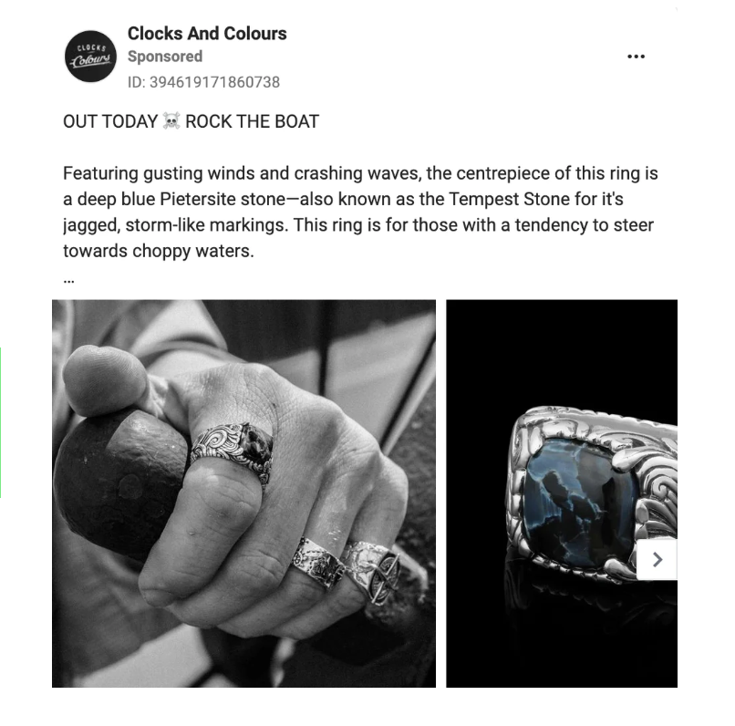 Quảng cáo bộ sưu tập có hộp trưng bày sản phẩm bên dưới quảng cáo, nơi người dùng quan tâm có thể nhấp để chuyển đến trang mua hàng hoặc thông tin sản phẩm chi tiết hơn.